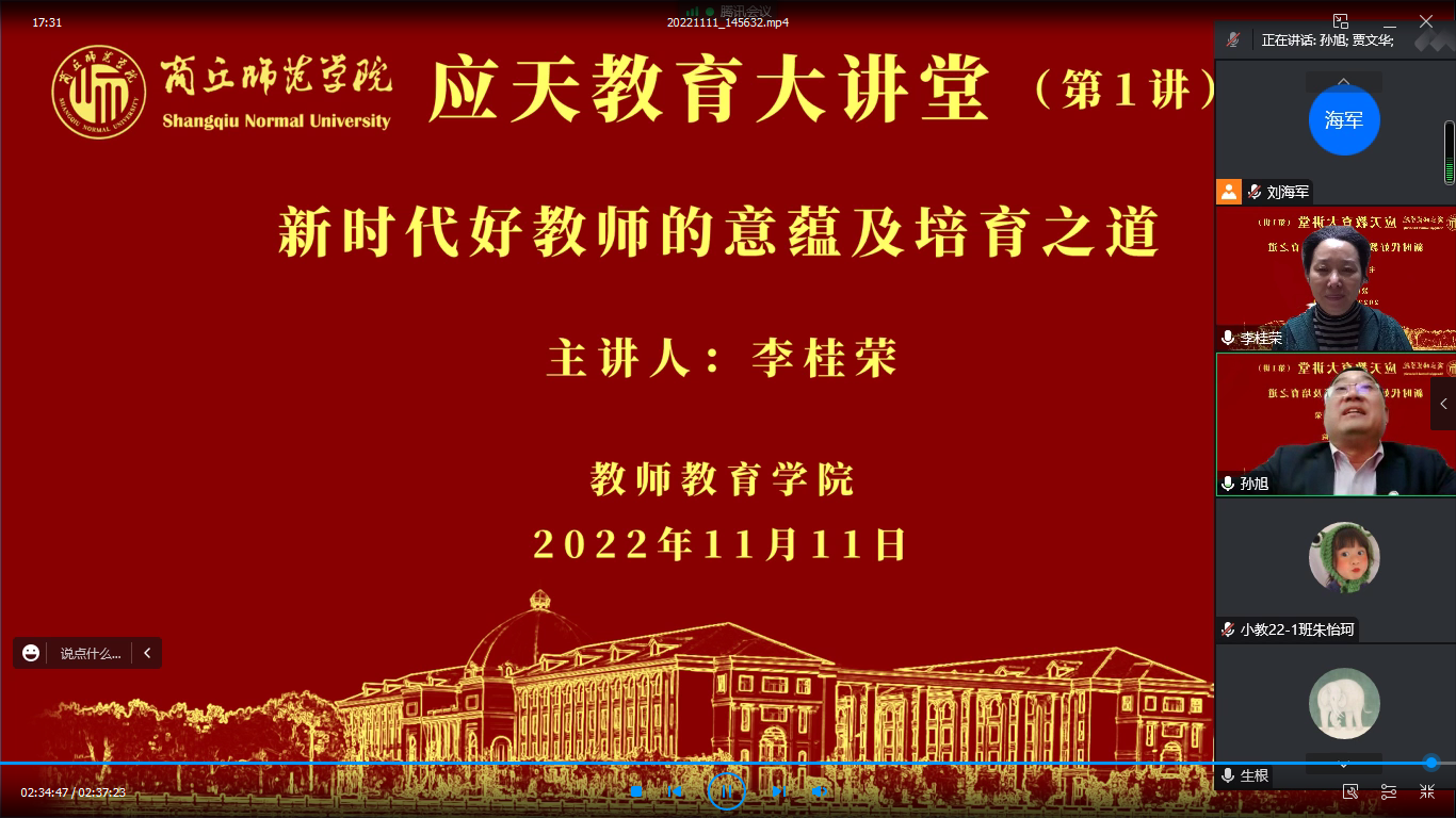 11月11日下午,公司365英国上市公司主办的“应天教育大讲堂”正式开讲,河南省教育学会教育学专业委员会理事长、河南大学教育学部博士生导师李桂荣教授以《新时代好教师的意蕴及培育之道》为题进行了第一讲,公司教师教育相关专业师生聆听了讲座。讲座由365英国上市公司经理孙旭主持。