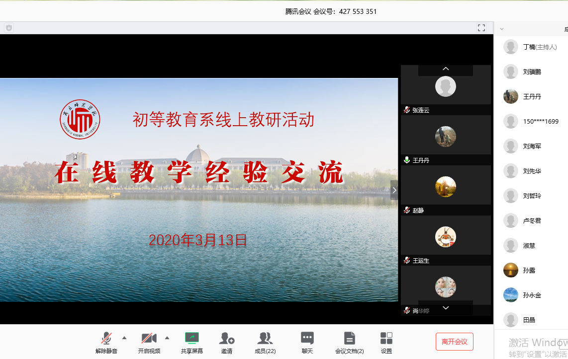 2020年3月13日下午14:30,初等教育系利用腾讯会议平台召开了线上教研活动。本次会议由系副主任丁楠主持,初等教育系全体教师参加了此次会议。