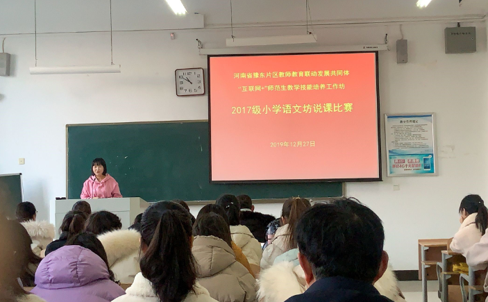12月27日上午8: 00,河南省豫东片区教师教育联动发展共同体子项目“互联网+”师范生教学技能培养工作坊活动——小学语文说课决赛在梁园校区行方楼203教室成功举办。此次比赛由丁楠老师主持,小学语文坊的坊主担任评委,2017级小学教育专业小学语文坊全体坊员参加了本次活动。