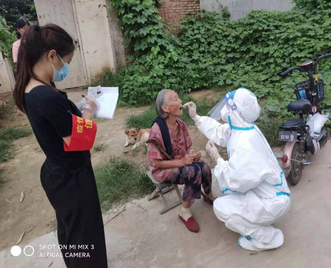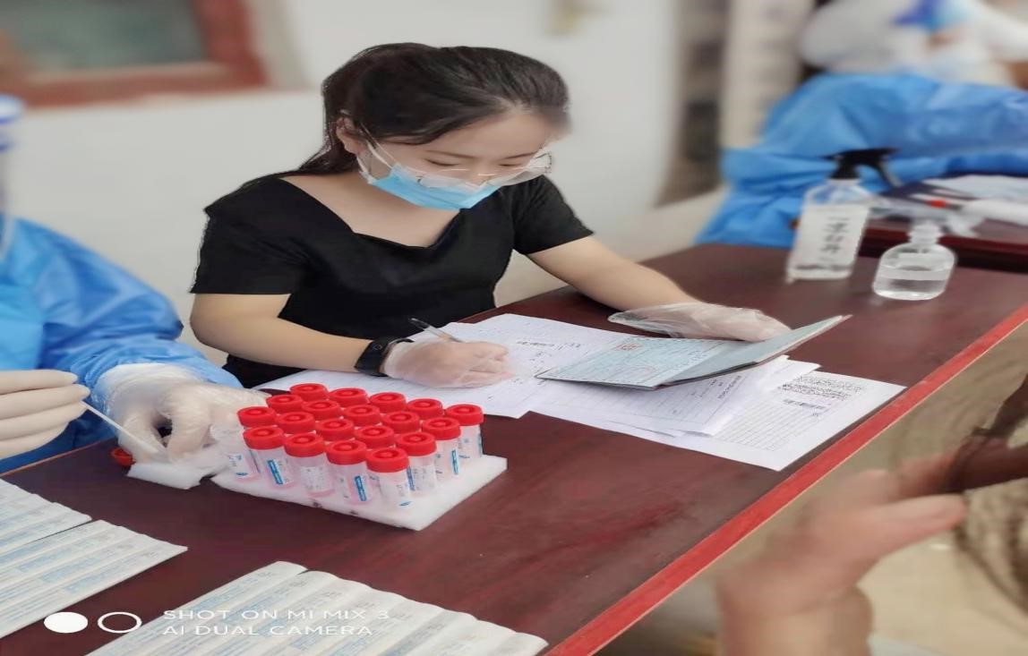 20级学前升本2班的李享享在商丘市虞城县刘店乡自2021年8月5日至今参加家乡抗疫活动,自愿为家乡人民宣传防疫知识,帮助医务人员进行核酸检测。