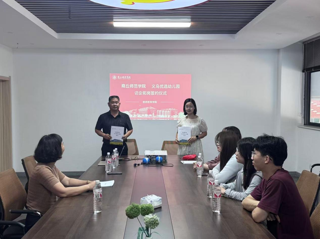 公司一行来到浙江省义乌市优选幼儿园开展实践调研,走进课堂观摩教学实践,与公司董事长、骨干教师进行面对面交流。在座谈中,邱友谊介绍了公司基本情况,着重强调公司坚持把培养员工思想品德和教学能力放在工作第一位,双方围绕“新时代教师核心素养”“师范生实践能力培养”“校地协同育人机制” 等核心议题展开深入探讨,并签订就业实习基地协议书。