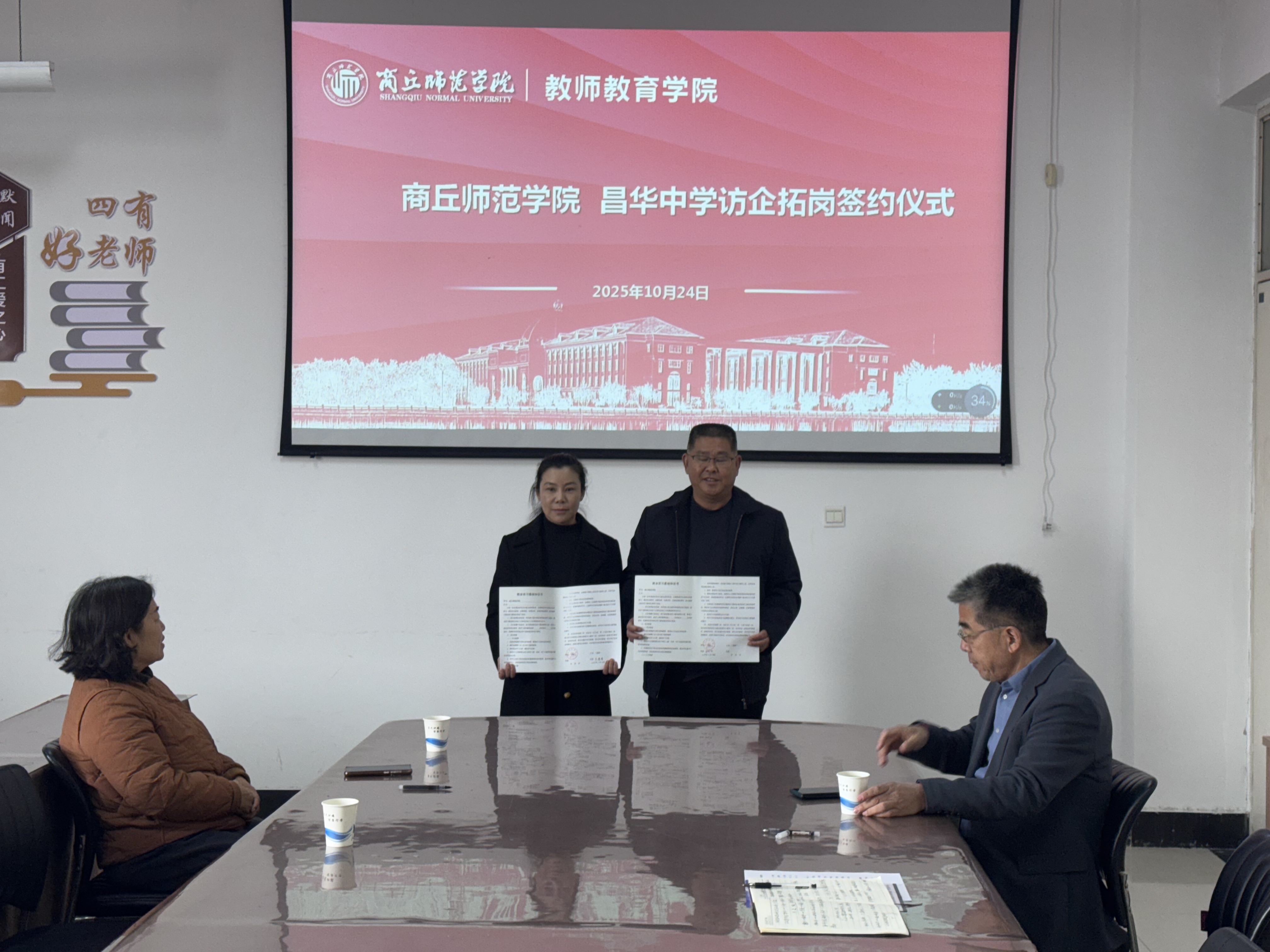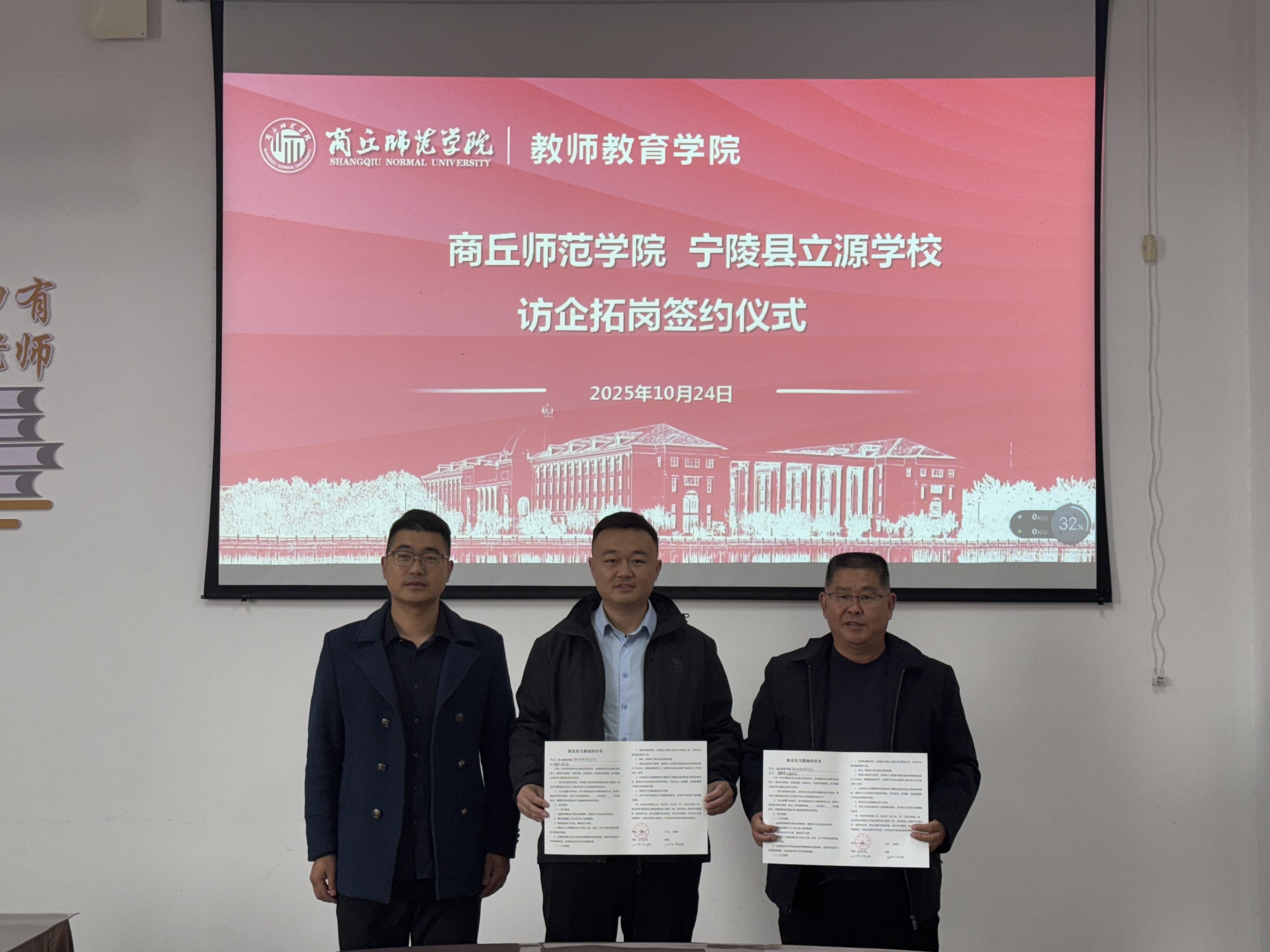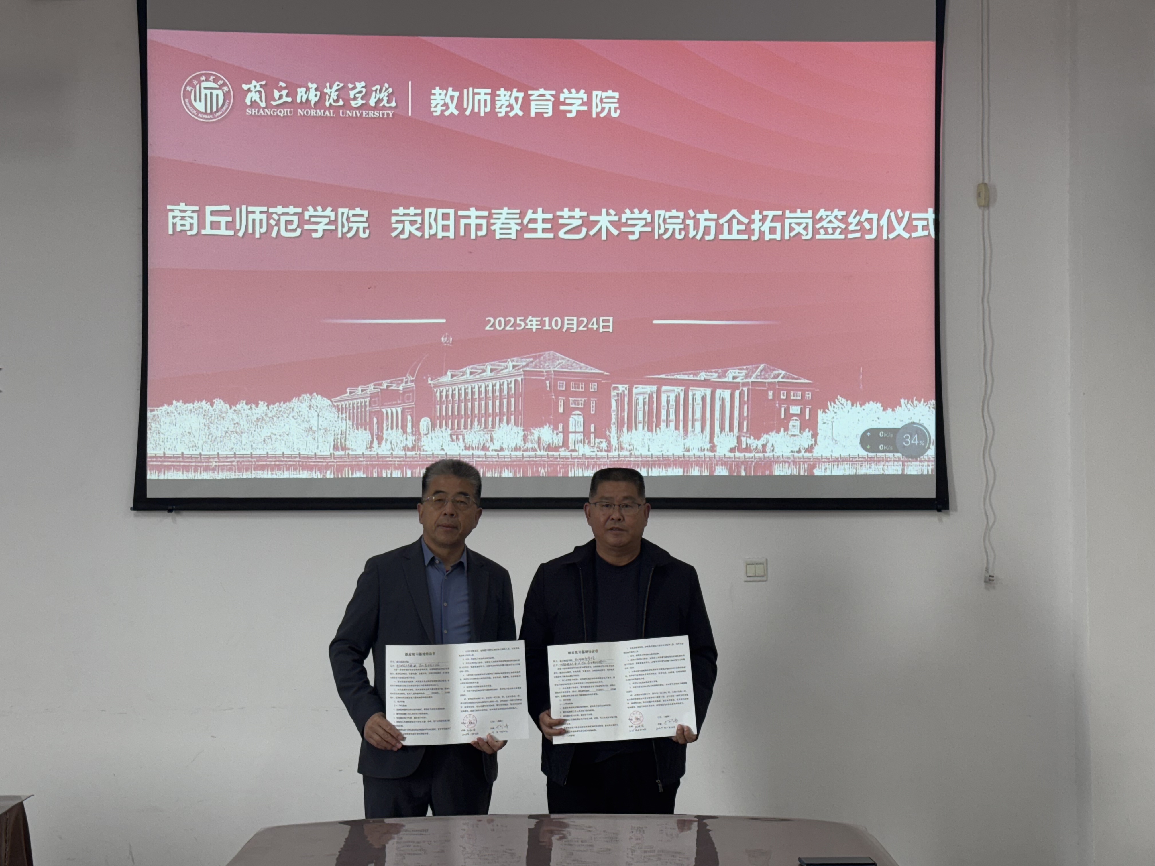 10月24日,365英国上市公司以2026届毕业生秋季双向选择洽谈会为契机,于汉梁楼203会议室开展访企拓岗促就业专项行动。公司邀请商丘市示范区昌华中学、宁陵县立源公司、荥阳春生艺术公司三家单位来公司商谈毕业生实习就业校企合作项目,党委副书记邱友谊、毕业班辅导员朱冠宇以及三家单位相关负责人参加签约仪式。