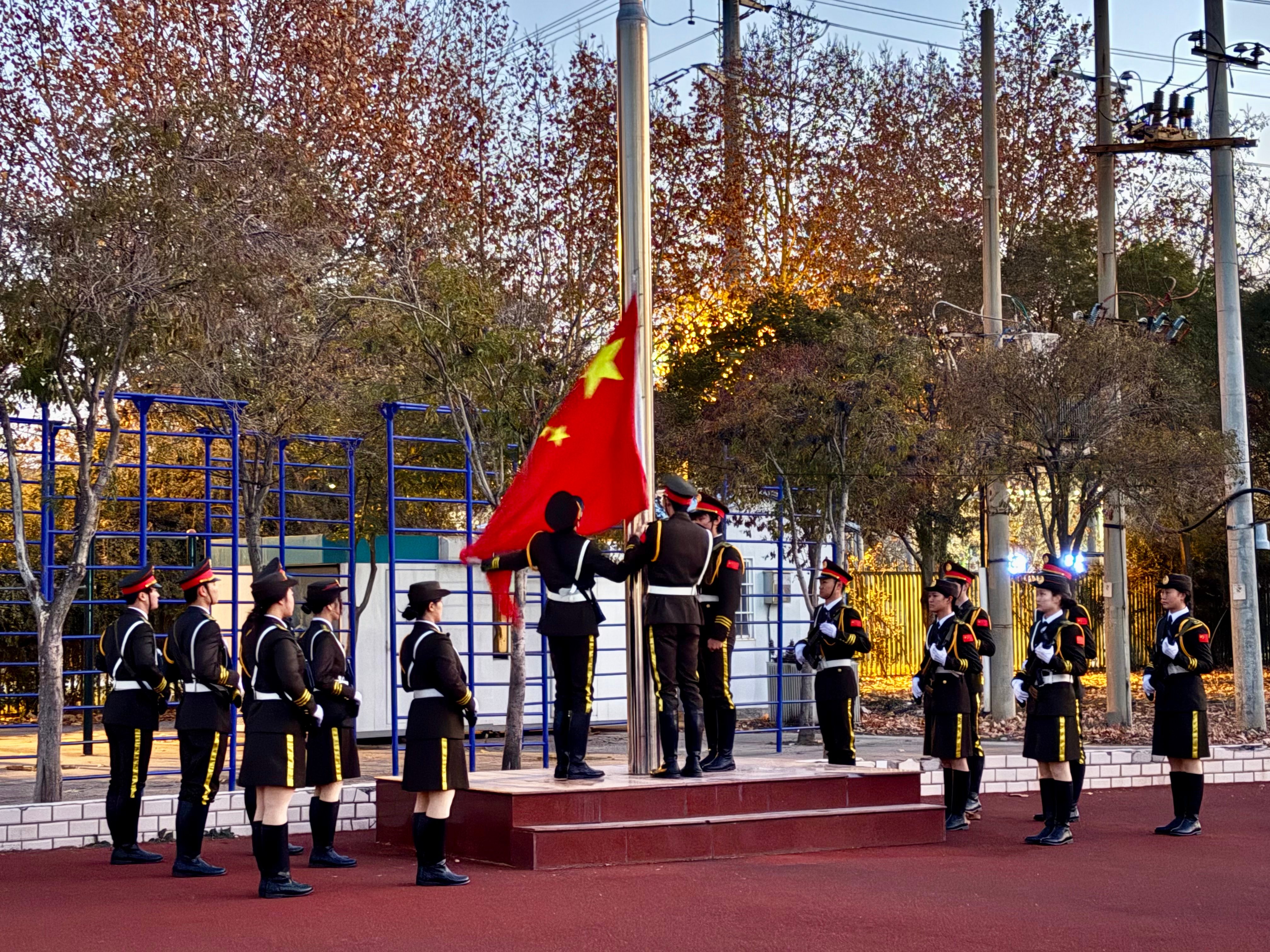 晨光熹微,伴随着激昂的号令,国旗班队员迈着铿锵有力的步伐,昂首挺胸护送鲜艳的五星红旗入场,每一步都彰显着青年学子的昂扬斗志。当庄严雄壮的中华人民共和国国歌奏响,激昂的旋律回荡在校园上空,全体师生肃立致敬,目光紧紧追随着冉冉升起的五星红旗,爱国情怀与责任担当在每个人心中激荡。