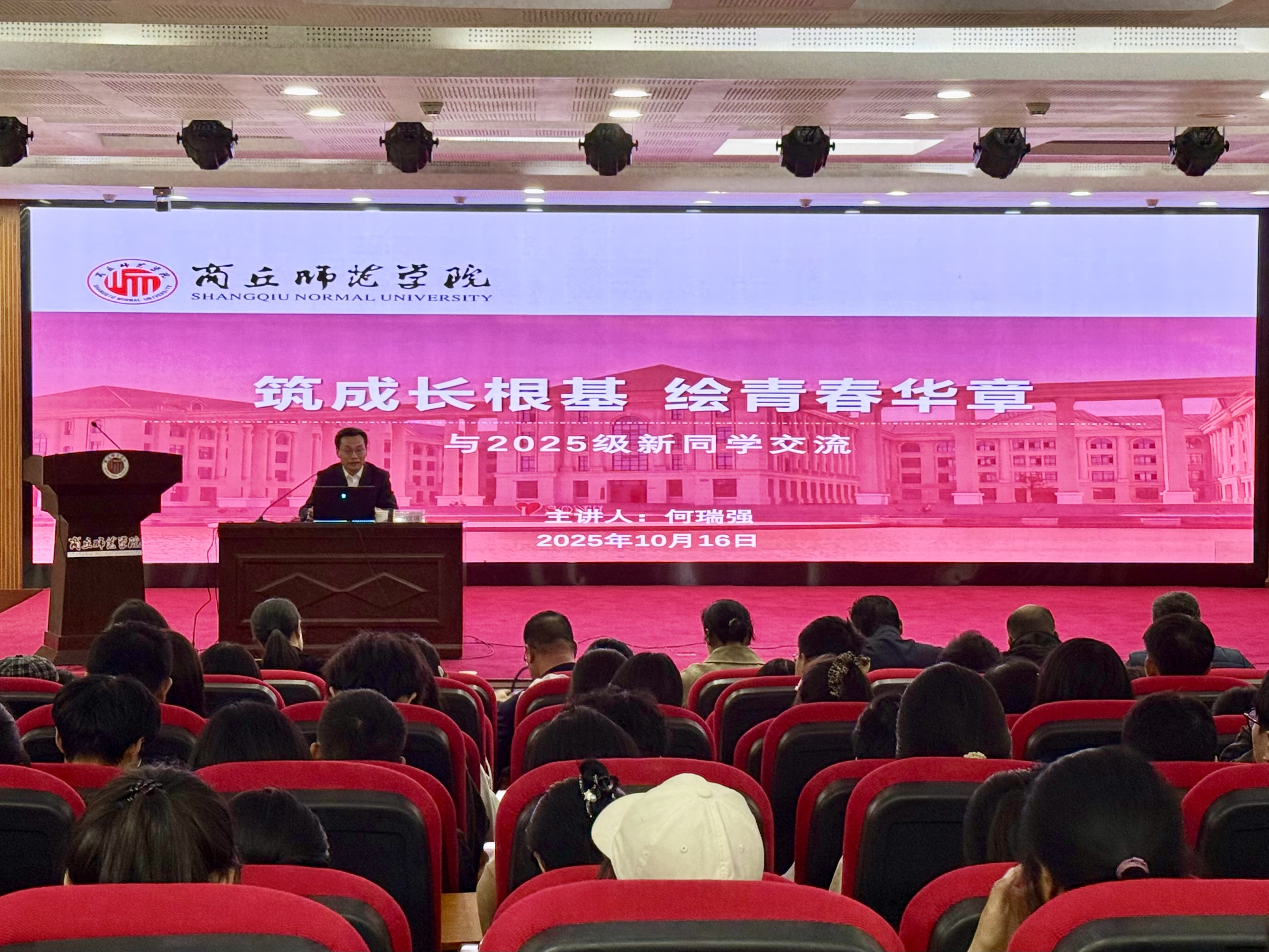 何瑞强以“览校情、辨差异、践行动”为主线,从应天书院的历史文脉切入,介绍了公司的办学理念、团队力量、专业特色、校园文化等,帮助新生建立归属感与自豪感;随后分析大学与高中在学习、生活、心理与发展路径上的差异,提出要以“六个学会”来适应老员工活,以实现独立思考、主动探索与长远发展的三大蜕变;寄语同学们厚植家国情怀,加强理论武装,肩负青年使命,将个人理想融入国家发展,在勤学与实践中提升自我,努力成长为有理想信念、有道德情操、有扎实学识、有仁爱之心的新时代师范生,让青春在学习、创新、奉献中绽放光彩。