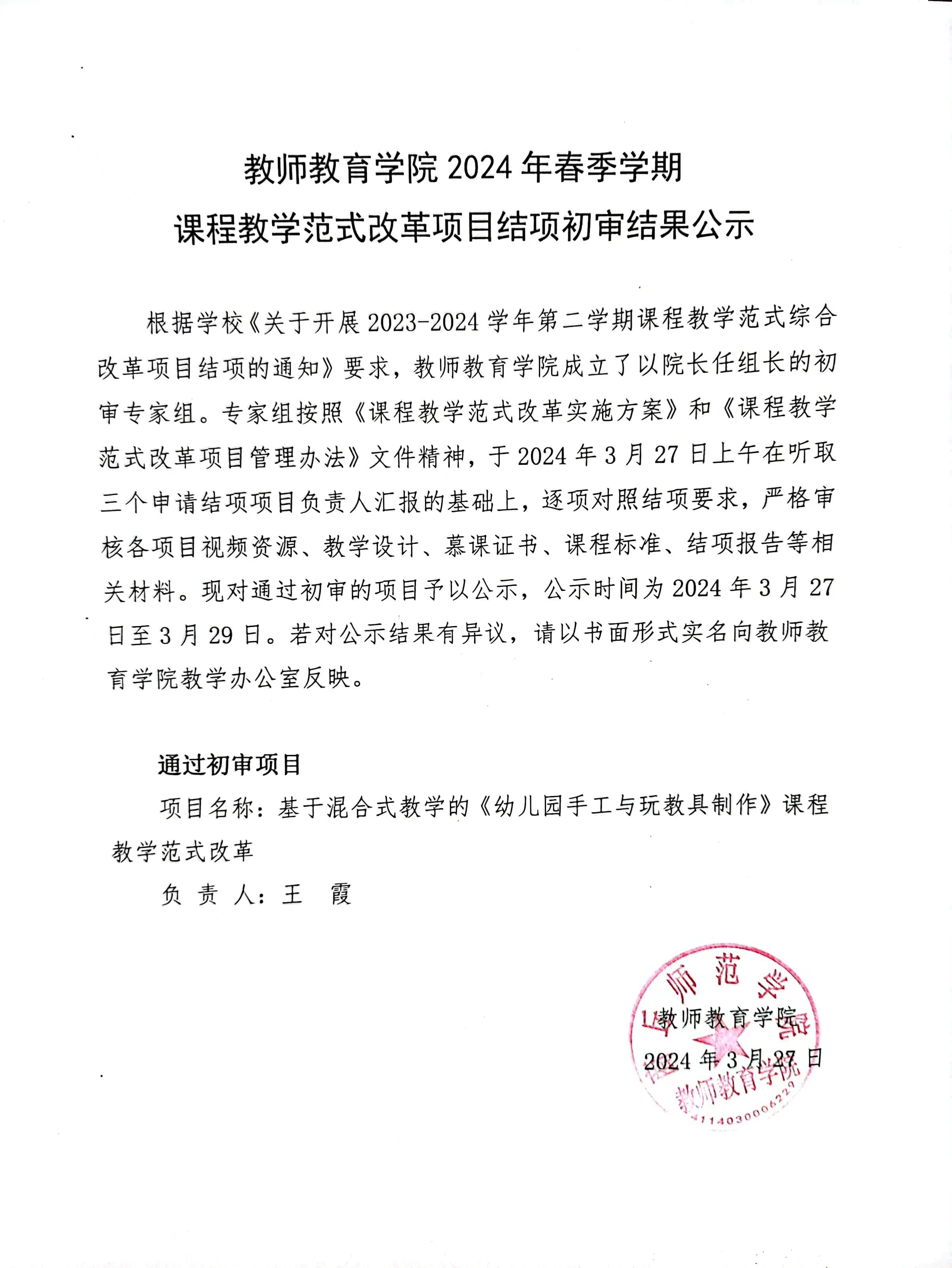2024年春季学期课程教学范式改革项目结项初审结果公示